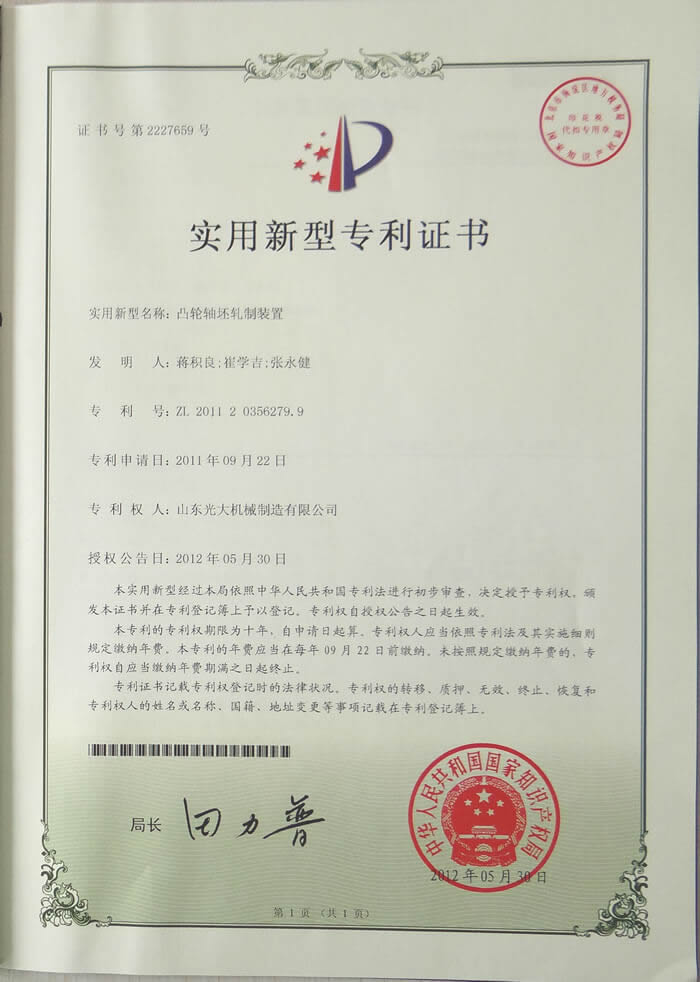 凸轮轴柸轧制装置-实用新型专利证书